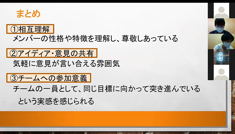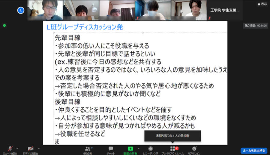 第1部では「居心地のよい団体をつくるためのコミュニケーション」と題した研修を実施しました。自治会・新聞会所属の学生による司会進行で、団体内の問題やアイディアをメンバーが安心して発信ができる環境づくりや、メンバーの団体への帰属意識を高めるための意識づくりについて、みつばちプロジェクトのリーダーを務めていた先輩学生による講演や、オンライン上で少人数に分かれてのグループディスカッションで意見交換を行い、参加者全員で共有をしました。