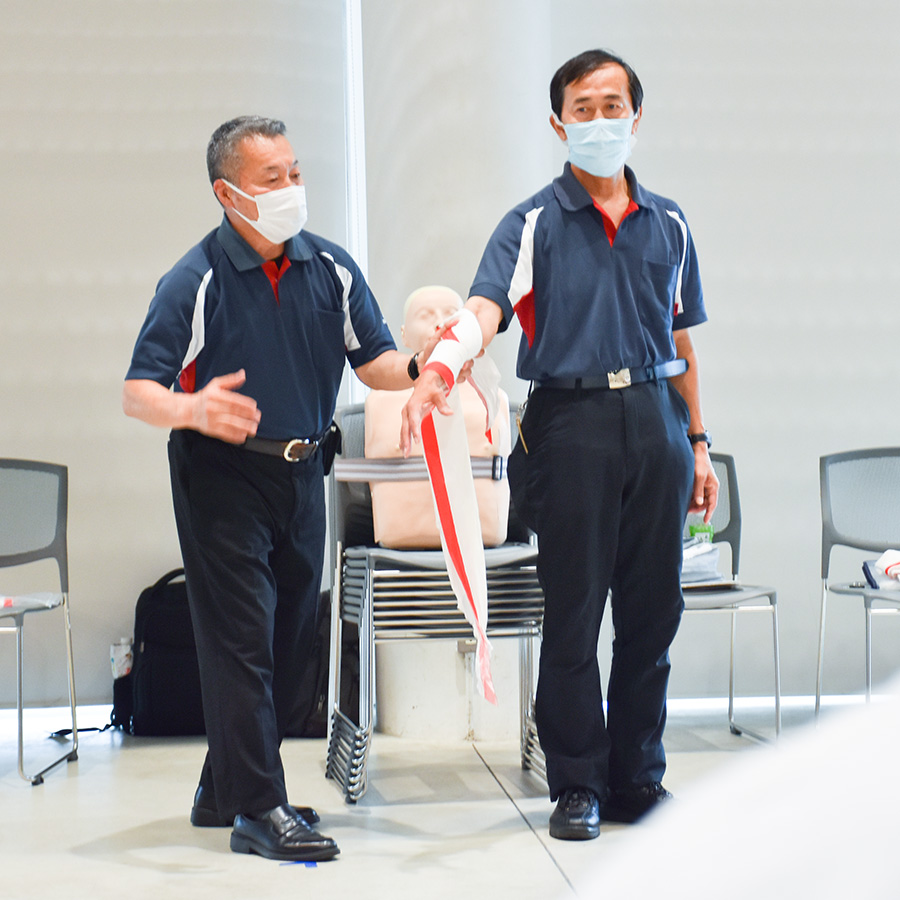 普通救命講習よりも一段階上のレベルのため、覚えることや実技も多く、講習は8時間に及びました。圧迫止血法での押す場所や強さなど、不慣れなことが続きますが、命を守るための行動ですので全員が真剣な表情で受講しました。実技では感染防止のため、自分の足や頭で三角巾の巻き方を確認し、全員が合格・取得しました。