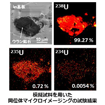 坂本教授らは、放射性同位元素を含め、種々の元素を同位体ごとに微小視野でイメージングする技術をJST先端計測分析技術・機器開発プログラム(2016~2019年度)において、世界で初めて高精度に同位体を識別したイメージング技術を開発した。下図はその一例。ウランを含む天然の鉱石を試料として用い、主要同位体である238-Uから、0.0054%しか含まれない234-Uまで微小視野で同位体別イメージングが出来ていることを示す。