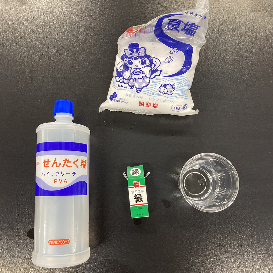 「スーパーボール」は、材料は水、洗濯のリ、食塩、食紅(絵具)の4つだけで、とても簡単に作ることが出来ます。塩析という現象を利用しており、普通の水に洗濯のリを加えるとそのまま溶けてしまいます。しかし、たくさんの塩が溶けた水に洗濯のリを加えることで、洗濯のりが水に溶けることができずに析出する性質を利用しています。この塩析という現象は、身近なと事だと石鹸の製造などに利用されています。