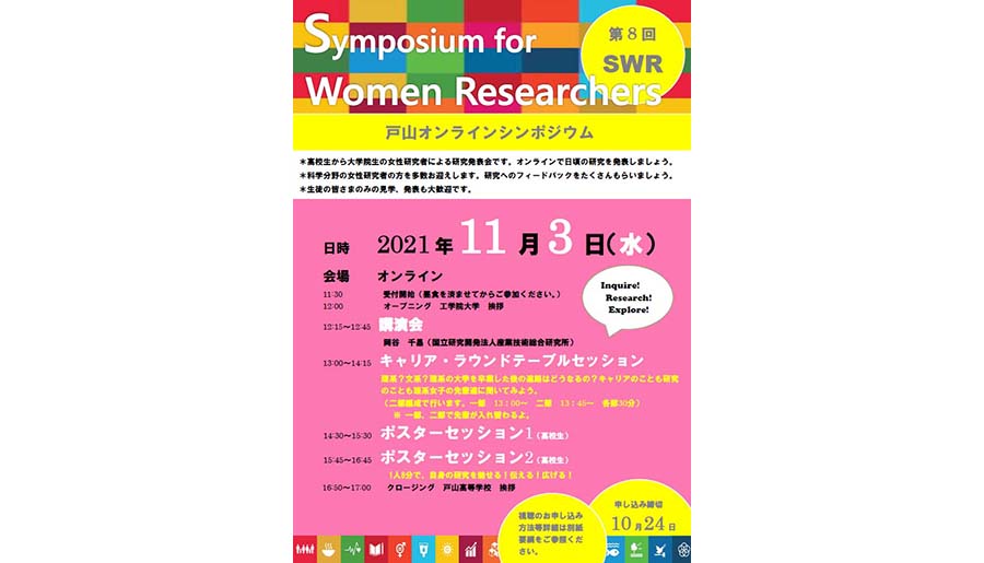 11月3日(水)に、理数系の高校生を主な対象者としたオンラインシンポジウム「The 8th Symposium for Women Researchers」(主催:東京都立戸山高等学校)をZoomにて開催します。協定校である工学院大学は共催として携わります。