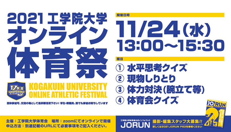 | この件に関するお問い合わせ先 | 体育会 体育祭実行委員 E-mail:wws2027@ns.kogakuin.ac.jp |