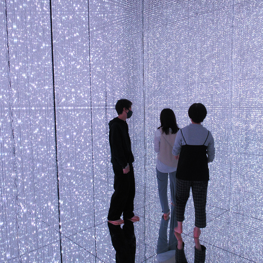チームラボプラネッツ TOKYO DMMは東京都内に3か所あるteamLabのミュージアムの一つであり、コンセプトは「他者と共に、身体ごと、没入する」で、超巨大な4つの作品空間と2つの庭園など、計9作品からなる「水に入るミュージアムと花と一体化する庭園」です。来館者は裸足になり作品を体験するため、参加学生たちは、これから先に何が起こるのだろうと初めての経験に胸を高鳴らせながら、ミュージアムに足を踏み入れました。
