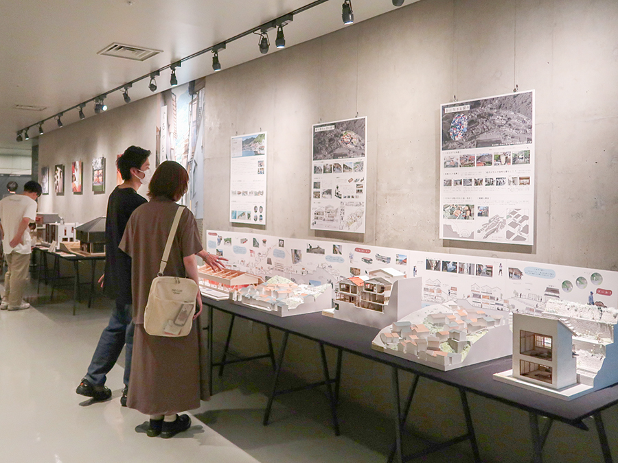 展示内容は、2020年春にまとめた調査報告書にもとづき、特徴的な地形や生業(漁業)から生まれた独特の住居形式や、路地と宅地の関係などを、模型・パネルでわかりやすく表現しました。また集落を俯瞰する美しいドローン動画や、迷路のような路地を歩き回るタイムラプスなど、まるで実際に集落に行ったかのような体験ができる展示となりました。