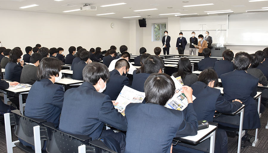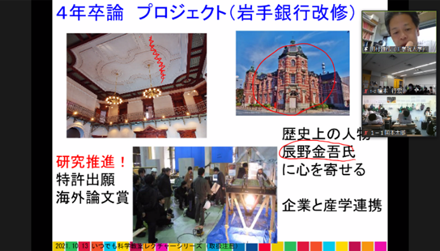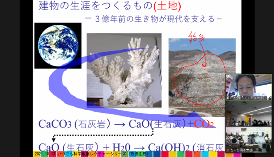 まず、10月13日に、附属高校1年サイエンスコースの生徒を対象に、田村雅紀教授(建築学科)がオンラインミニ講義を実施しました。前半は工学院大学の学部・学科に関する説明、後半は田村教授の研究分野である材料学の魅力が語られました。