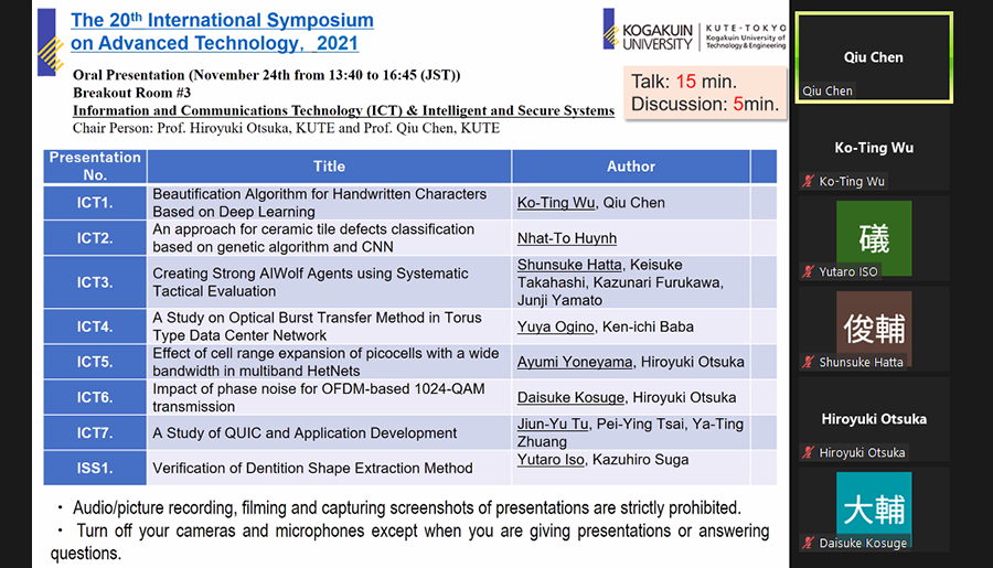 2021年11月23日~24日の期間で、「第20回国際先端技術シンポジウム」 (ISAT-20)をオンラインで開催し、本学や海外協定校の教員・学生などあわせて400人を超える方々にご参加いただきました。