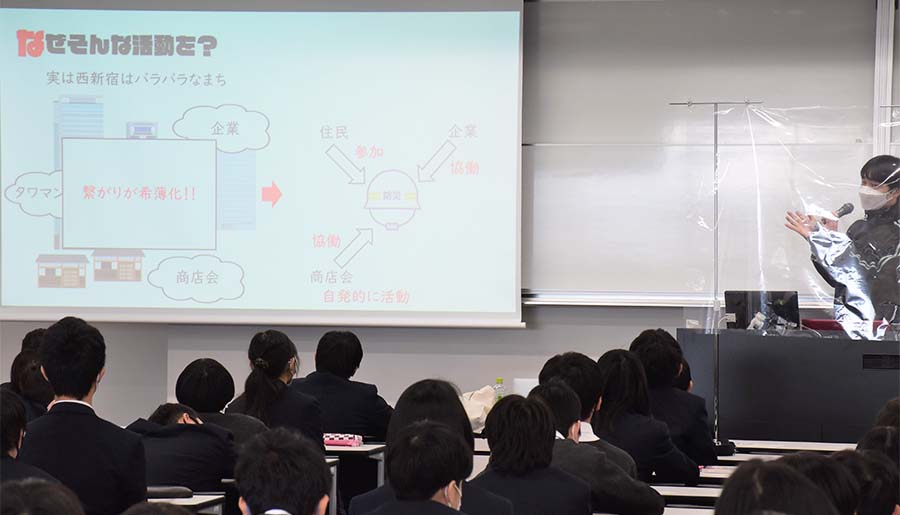 同プロジェクトは、新宿キャンパスの建つ西新宿で、地元のお祭りに神輿の担ぎ手として参加したり、地域の見どころをオンラインマップに掲載したり、新宿区商店街活性化事業に参加することで、まちの人と人を結びつける活動を続けています。今年は、初めて日帰り防災キャンプやオンライン工作教室を開催するなど、コロナ禍でも人と人とがつながる活気あるまちを作ろうと活動しています。