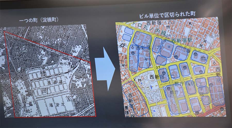 活動におけるコンセプトやイベントチラシなどのデザイン過程を、今回は「ぬり絵でまち開発」のタイトルで中学生1‐3年にお話ししました。まず、今の西新宿はかつて淀橋と呼ばれていたことと、現在の同地域は、商店会を中心に古くから住む住民とタワーマンションに住む比較的在住歴の浅い住民、高層ビル群の企業と分断されがちな状況が示されました。この解決に向けて大学生が主体的に取り組み、新宿駅周辺再開発が終わる2030年頃には状況が少しでも改善されるように、防災やSDGsと関連させたイベントを次の時代の文化として定着させようと開催していることが紹介されました。