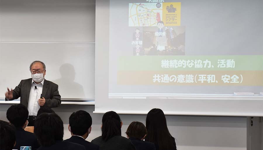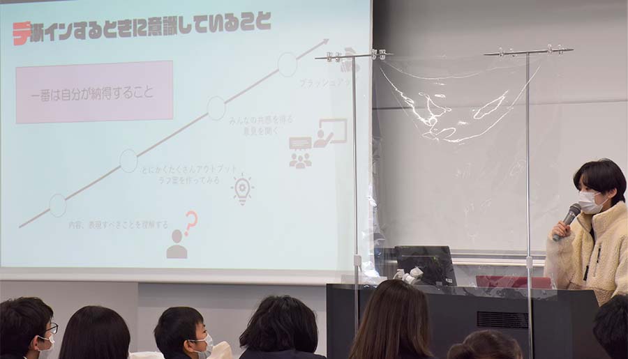 説明を担当した大学生は、まちづくり学科と建築デザイン学科に所属しています。大学生が中学生に説明するのはこれが初めての機会でしたが、具体的な例を挙げたことで、まちづくりやデザインが社会とどのように関わるのか、中学生にも感じ取ってもらえた様子でした。中学生は、慣れない大学教室での講義に初めは戸惑っていましたが、説明が始まると普段の授業とは違う内容に惹かれていました。 今回のような中高大連携を通して、中学生・高校生が将来なりたい自分をイメージでき、中学校・高校での学びがより充実したものになるよう、大学も協力して環境を整えています。