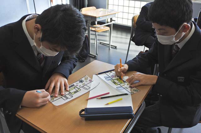 その一つが来週から開催されるキャンドルナイトで、多くの人がつながる方法としてぬり絵が使われている説明がありました。自分たちに何ができるか模索しながら試してみることを中学生にもぬり絵で体験してもらいたいと、中学生には2タイプのぬり絵(イラスト、白紙)が配られました。中学生のぬり絵作品は、来週中に大学に届き、キャンドルナイト会場を彩る予定です。白紙に描かれたデザインは次回のキャンドルナイトのぬり絵の候補として、ぬり絵で参加するだけでなくキャンドルナイトを主催する側にも参加する機会を拡大しようと考えています。附属中学校校舎では、大学から戻った生徒が早速色を付ける様子が見られました。