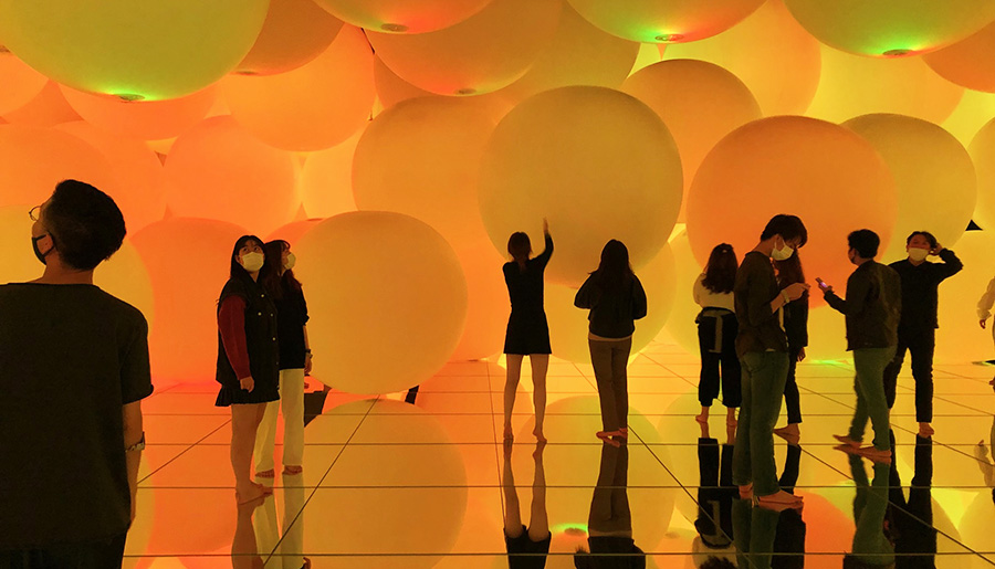 学生たちは、10月26日にチームラボアーキテクツが手掛けるデジタルアートミュージアムの一つである「チームラボプラネッツ TOKYO DMM(東京都江東区豊洲)」を見学し、五感すべてを使い身体ごと没入するような空間に、コンペティションに向けて大きな刺激を受けました。