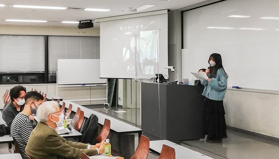 11月4日には中間発表会が行われました。参加学生が写真を用意し、現時点で考える「死を迎えるための空間」への着想を発表しました。抽象的な風景から鳥居など死後の世界を連想させる物の写真まで、十人十色のイメージが語られました。また、チームラボ、チームラボアーキテクツの独自の手法で「アイディアは他人とシェアするもので、シェアしたアイディアから発展させていく」=「共創」という考え方を元に、それぞれの発表にチームラボや参加学生がコメントし、最終発表会までに他者から刺激を受け視野を広げる機会になりました。