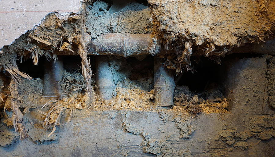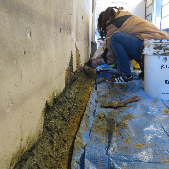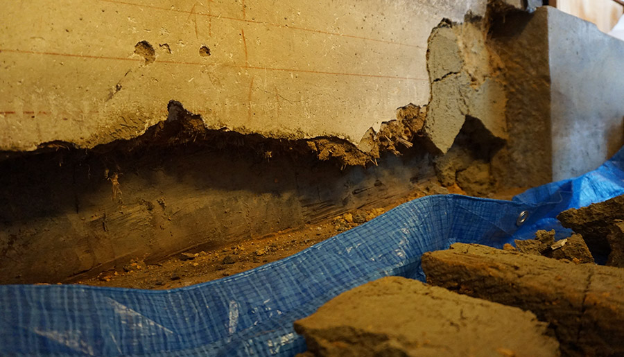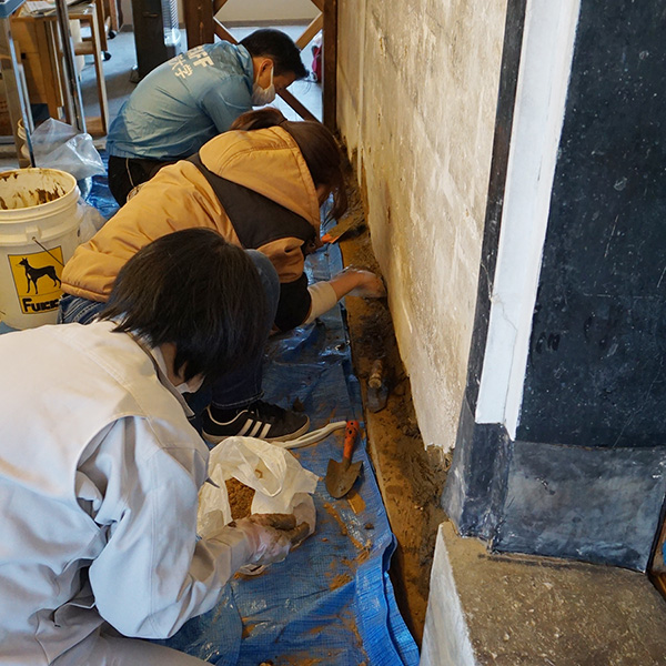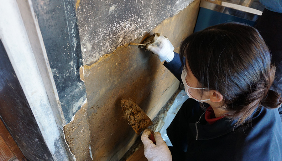 漆喰壁は、建築当時の状態が広範囲で残る貴重な部分です。なまこ壁は、象徴的な外観を保つために無くてはならないものです。いずれも、これまでに何回か部分補修が行われていますが、伝統的な当初材料とは違う材料が使われてきました。今回は文化継承の観点を重視し、田村研究室は、昨年から訪問するたびに現地で拾い集めた壁土を大学八王子キャンパスに持ち帰り、材料を分析。既存の土壁と同等の材料を混ぜ合わせ、さらに、壁土の乾燥化に伴うはがれ防止を目的に接着力が高まる成分を加え、現存する壁と親和性の良い壁土を作り出しました。今回は、それを漆喰壁の土台部における剥落部分に荒壁を入れ込む作業が大半を占めました。