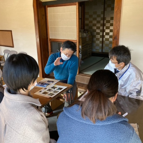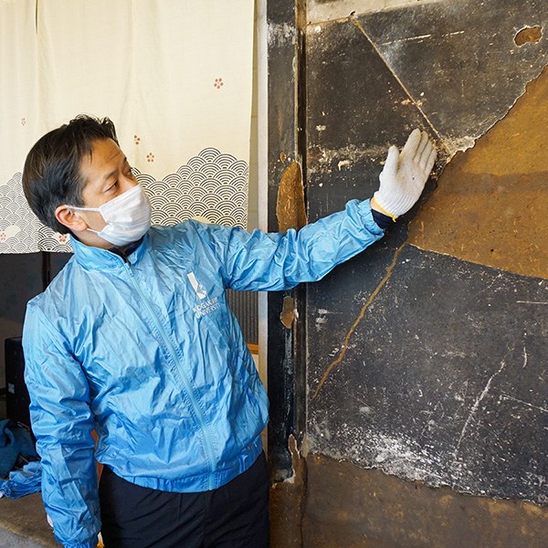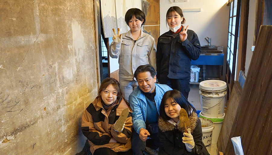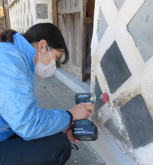 この建物「上(かみ)の家」は文豪・井上靖の母の実家です。壁や梁などの老朽化が顕著で、伊豆市の委託を受けて西森研究室(建築デザイン学科)と田村研究室(建築学科)が改修し、11 月 23 日にお披露目しました が、文化的な価値を保つため田村研究室は旧来の土壁・漆喰壁の補修を続けています。この日は、漆喰壁の補修となまこ外壁の汚れ部の削りだしを行いました。