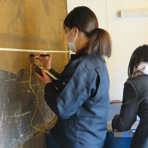 ・土壁の材料に直接触れたり、土壁の表面硬度を測定したり、さらになまこ壁の表面を削ったりするなど、短い時間でしたが土壁保存改修に携わることができて嬉しかったです。