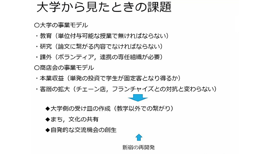 まず、地域の歴史と2017年から続く大学との交流の概要を三木教授が共有。その後、品川副会長から「高齢者がほとんどなので、何かと若い人の力を借りざるを得ない。」「商店会は歴史あるお店が多くメンバーが固定。学生が祭りなどに入ることで活性化した。」と商店会の状況と変化が共有されました。 2018年には、東京オリンピック500日前イベントの企画・運営など、学生と十二社商店会のみなさんが共に力を合わせて開催するイベントの開催で結束を強めました。これまでの交流を振り返り、品川副会長は「学生ボランティアと扱うのではなく、頼れる仲間として接してきた」と語りました。学生の永山さんは、「まちに学生時代から関われることが最大の魅力。そして、地方出身者の自分にとっては“東京にも温かい人との交流がある”と感じられたことが活動を継続できたポイント」と活動を振り返りました。