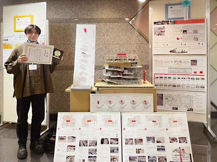 他大学から集まった力作揃いの中から、自分の作品を評価して頂けたことはとても嬉しいです。特に問題解決に対するアプローチの面白さ、建築の設計力を評価して頂けたことはとても自信に繋がりました。これからも様々な視点から建築を考え、設計力を身につけていきたいと思います。