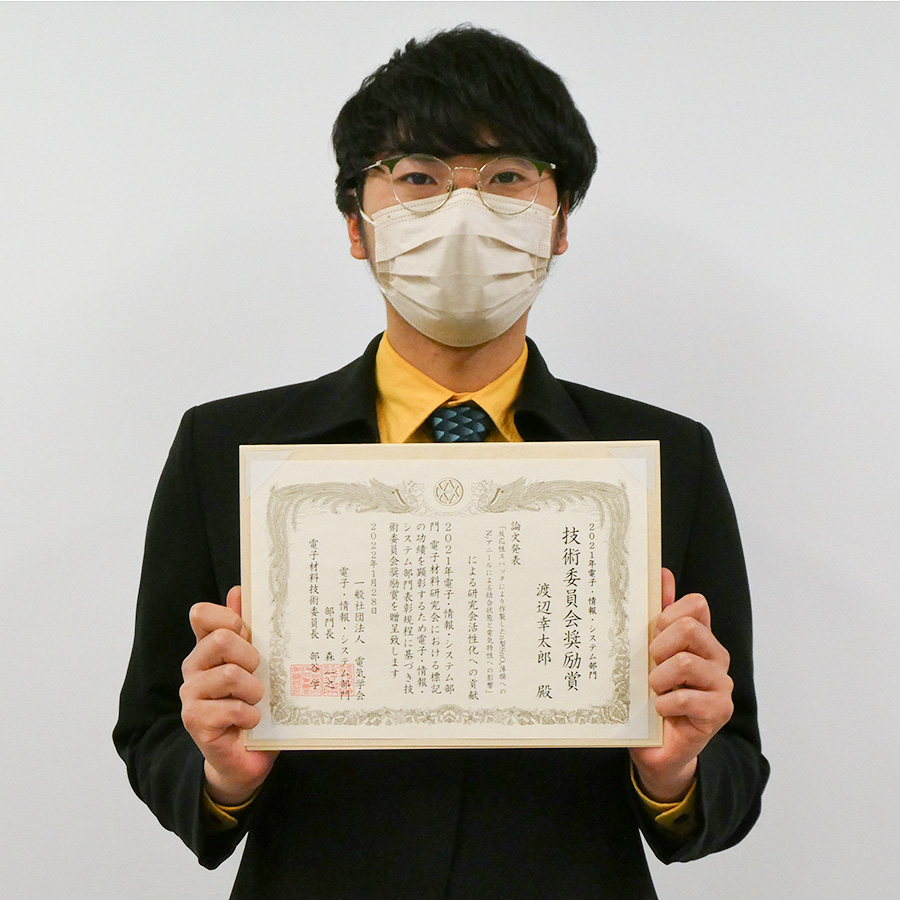 2021年11月18~19日に、オンラインで開催された電気学会 2021年電子・情報・システム部門 電子材料研究会において、電気・電子工学専攻修士1年の渡辺幸太郎さん(高機能デバイス研究室・相川慎也准教授)が技術委員会奨励賞を受賞しました。