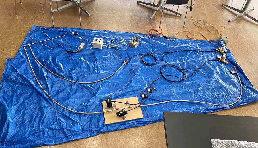 燃焼班は、GSE(地上支援装置)を展開しました。フレキシブルチューブに繋げる施工を終えています。