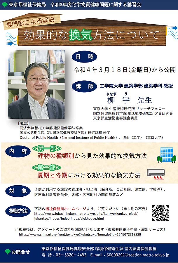 柳宇教授(建築学科)は、化学物質健康問題に関する講習会(東京都福祉保健局主催)に講師として出演しました。子供が利用する施設の管理者や担当者に向けて、室内化学物質対策の基本的な考え方や、効果的な換気方法を説明します。動画は東京都福祉保健局の公式ページで、3月18日より一般に無料公開されています。