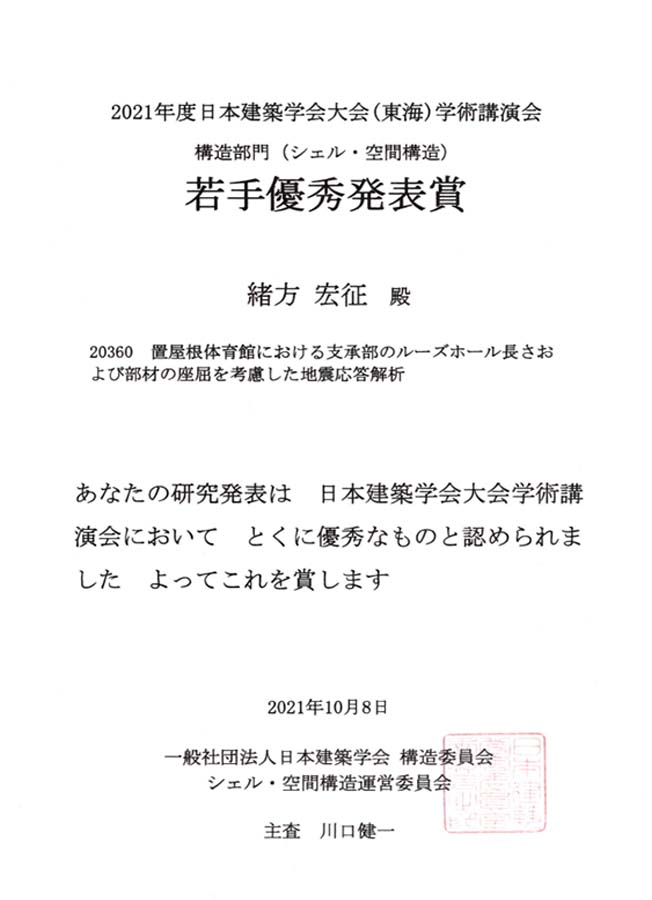 Home 2021年度のお知らせ 建築学専攻生が日本建築学会 学術講演会(構造部門)で若手優秀発表賞を受賞 建築学専攻生が日本建築学会 学術講演会(構造部門)で若手優秀発表賞を受賞 2022/03/25 シェアする 2021年9月に開催された2021年度日本建築学会大会(東海)学術講演会における構造部門(シェル・空間構造)の研究発表にて、建築学専攻の緒方宏征さん(山下研究室・山下哲郎教授)が若手優秀発表賞を受賞しました。 この賞は、空間構造の耐震設計に関連する2セッションで発表した者の中から、30歳以下の若手1名に授与される賞です。受賞研究は、大型体育館において、鉄骨屋根を支える支承部周辺の鉄骨トラスの部材に座屈が生じる原因を地震応答解析で説明しています。 建築学専攻 前へ 一覧に戻る 次へ
