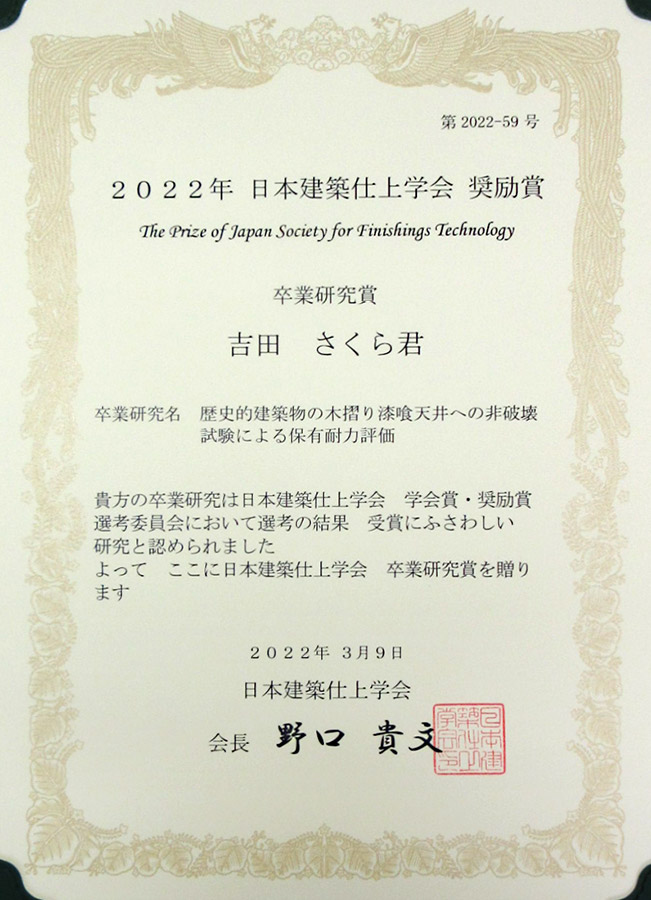 | 吉田さくら | 2021年度日本建築仕上学会奨励賞・卒業論文賞 | 歴史的建築物の木摺り漆喰天井への非破壊試験による保有耐力評価 |
