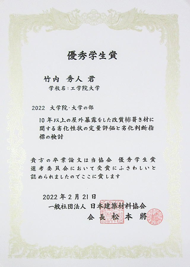 | 竹内秀人 | 2021年度日本建築材料協会優秀学生賞・卒業論文部門 | 10 年以上の屋外暴露をした改質柿葺き材に関する劣化性状の定量評価と劣化判断指標の検討 |