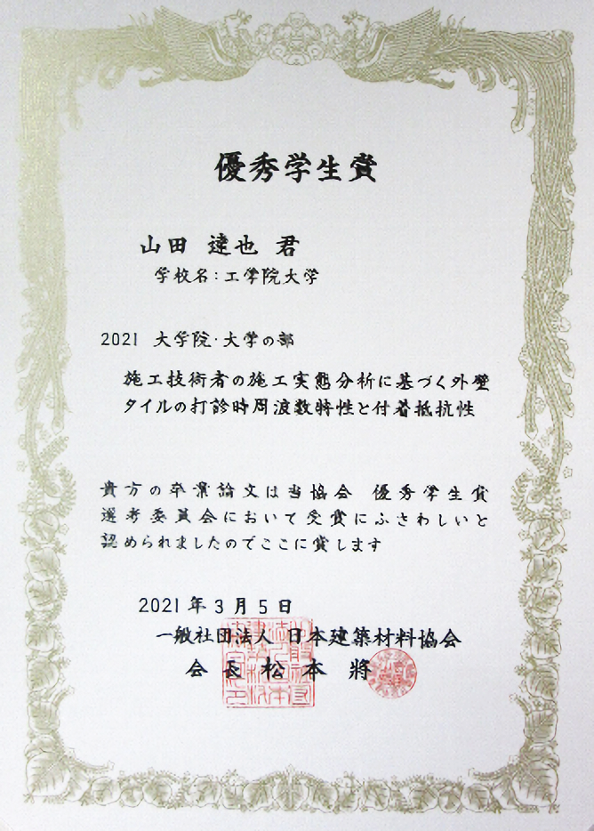 建築学科生が日本建築材料協会より優秀学生賞を受賞