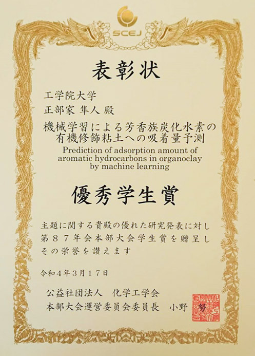 2022年3月16日~18日に開催された化学工学会第87年会において、先進工学部環境化学科4年(受賞当時)の正部家隼人さん(環境計算化学工学研究室・高羽洋充教授)が 優秀学生賞を受賞しました。