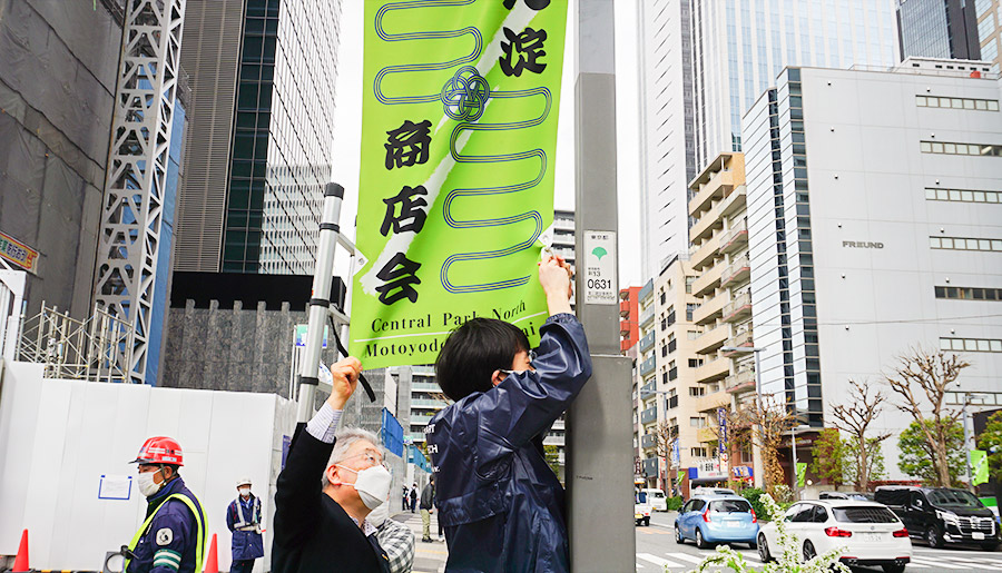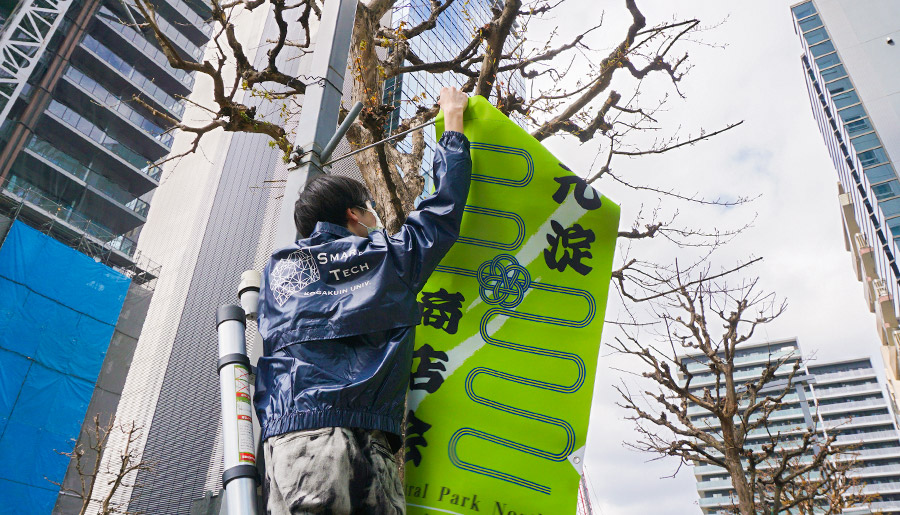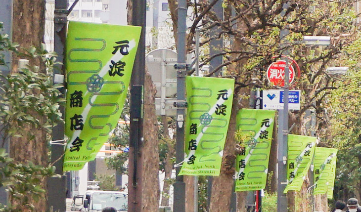 まち開発プロジェクトは、元淀商店会(新宿区西新宿6丁目)の街頭を飾るフラッグをデザインし、3月30日に設置しました。この活動は、新宿区が進める商店街活性化事業「大学連携事業」の一つです。