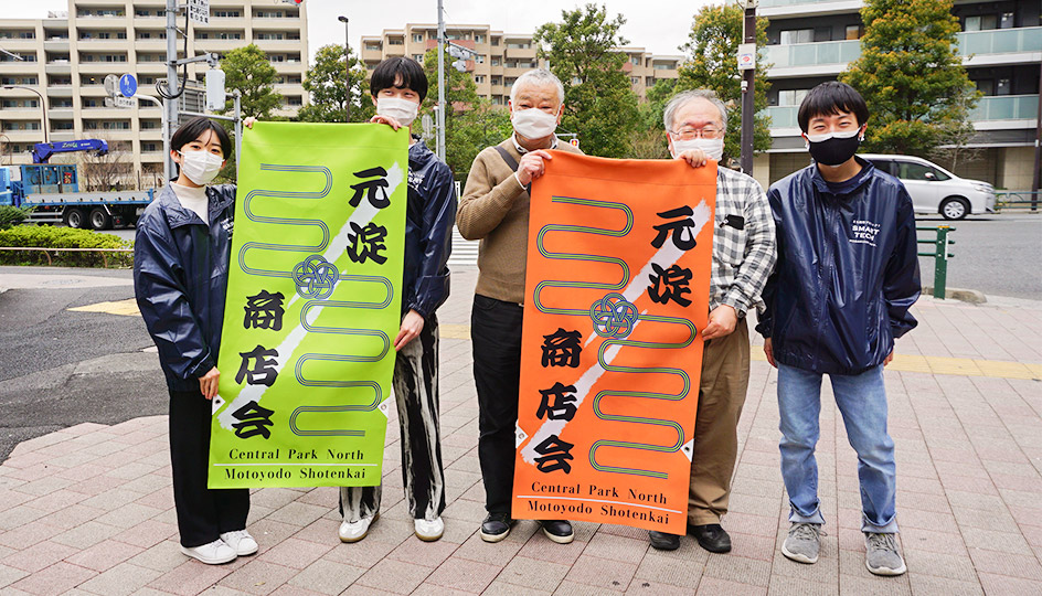 設置場所の元淀商店会は、歴史ある商店会です。地下鉄の開通に伴い会員商店の数は減り、高齢化が進んでいます。7月に商店会の方とお会いしてからは、8月-9月と毎月打ち合わせを重ね、商店会からの要望と地域の様子を整理して、デザイン案提出・調整と進めていきました。そして3月30日には、出来上がったフラッグを手に学生が現地で設置しました。