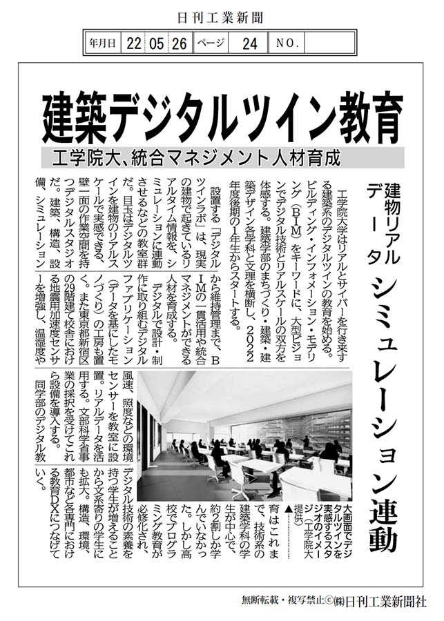 文部科学省による「デジタルと専門分野の掛け合わせによる産業DXをけん引する高度専門人材育成事業」に本学の「デジタルツインラボを活用した建築デジタル教育」が採択されました。 採択された提案内容は、日刊工業新聞(5月26日付)でも紹介されました。