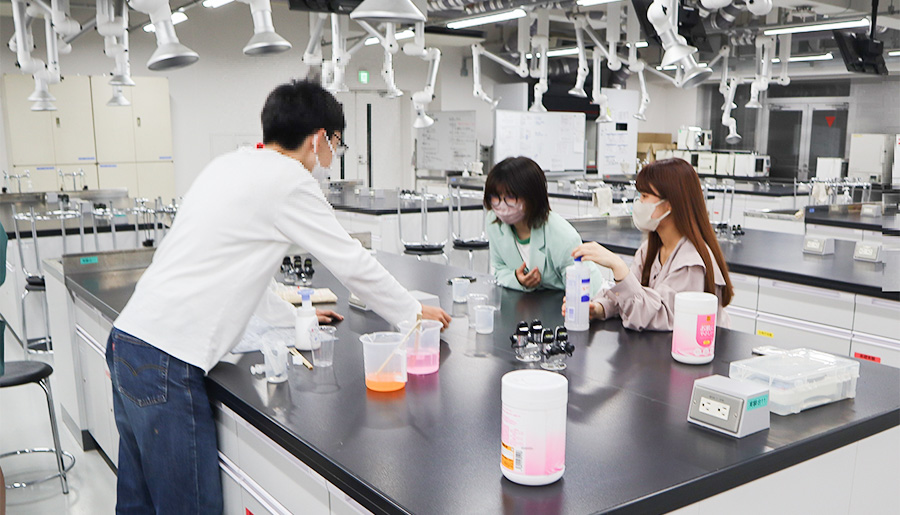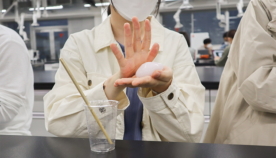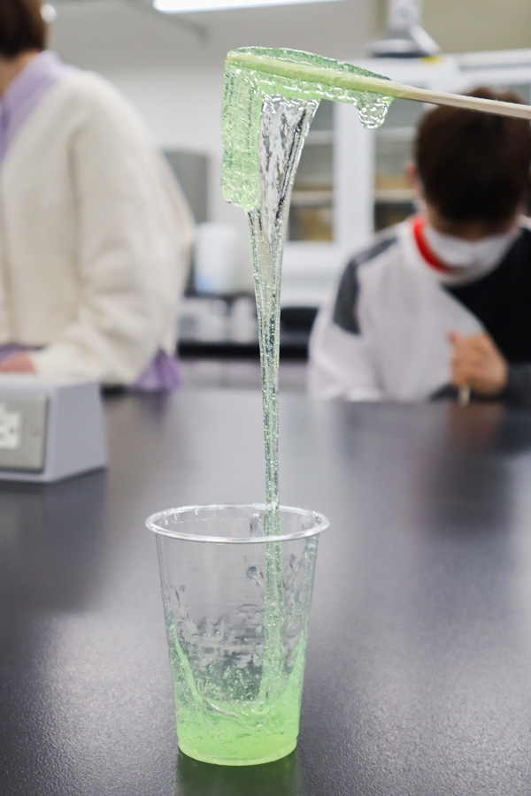 4月25日(月)に4号館4階の実験室で行われた通常活動では、6月に開催される八王子環境フェスティバルで、スライム実験を小さい子向けにしっかり教えられるかを練習しました。多くの新入生が体験をしに訪れ、2年生が1度お手本を行ってから1年生が実践する形で、理論や作り方の説明を練習しあいました。