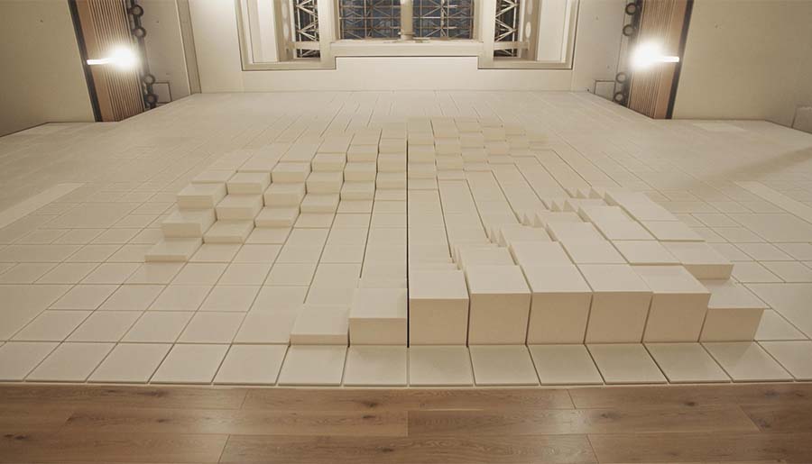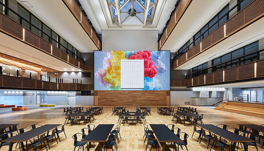 高さ12.8m、幅16m の巨大4K スクリーンに可動キューブがうごめくキネティックウォール(常設 国内初*)を備えた、多目的学園ホールです。映像・音響・照明を組み合わせた多彩な演出表現が可能で、教育、式典、学術利用の他、音楽、アート活動まで幅広い利用が可能です。
