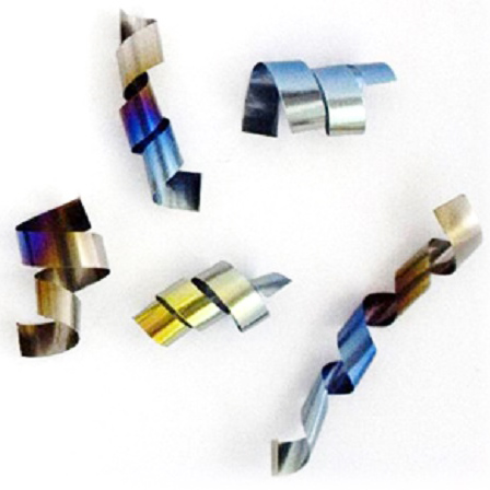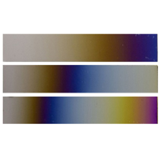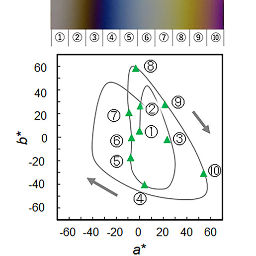 駆動電極と試料の配置の組み合わせや印加電圧,電解時間を調整することで、単色だけでなく、対称性のあるグラデーションやオイルスリック模様のカラーリングにも成功しています。