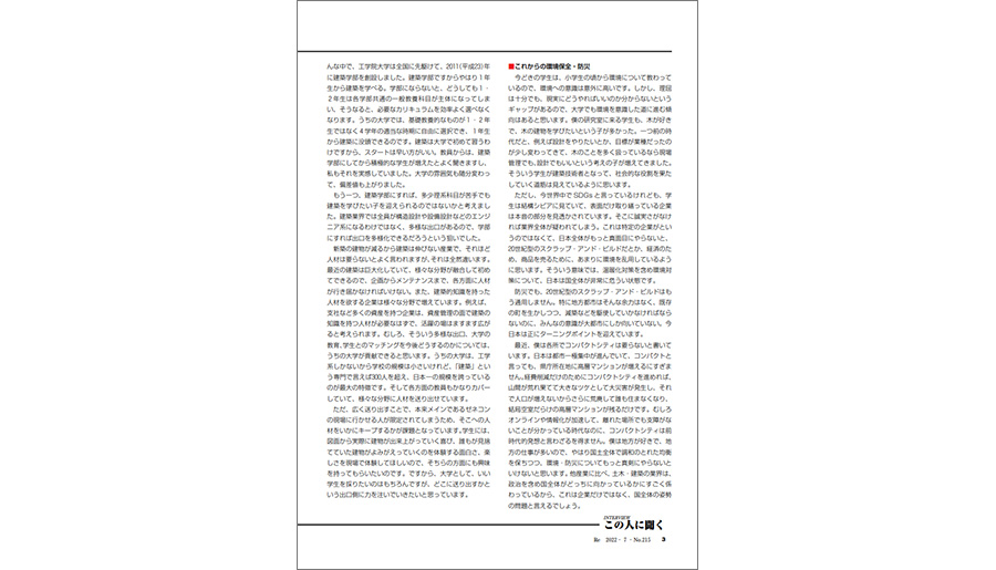 Home 2022年度のお知らせ 後藤治理事長のインタビューが建築保全センター機関誌に掲載されました 後藤治理事長のインタビューが建築保全センター機関誌に掲載されました 2022/08/02 シェアする 後藤治理事長のインタビューが、建築保全センターの機関誌「Re」215号に掲載されました。 後藤理事長が携わった建築物の保存活用の事例や、2011年に本学に創設された国内初の建築学部の意図などについて語っています。 一般財団法人建築保全センター機関誌「Re」215号掲載インタビュー記事 【画像クリックでPDFファイルをご覧いただけます】 一般財団法人建築保全センター機関誌「Re」215号掲載インタビュー記事 【画像クリックでPDFファイルをご覧いただけます】 一般財団法人建築保全センター機関誌「Re」215号掲載インタビュー記事 [2.63MB] 一般財団法人 建築保全センター 前へ 一覧に戻る 次へ