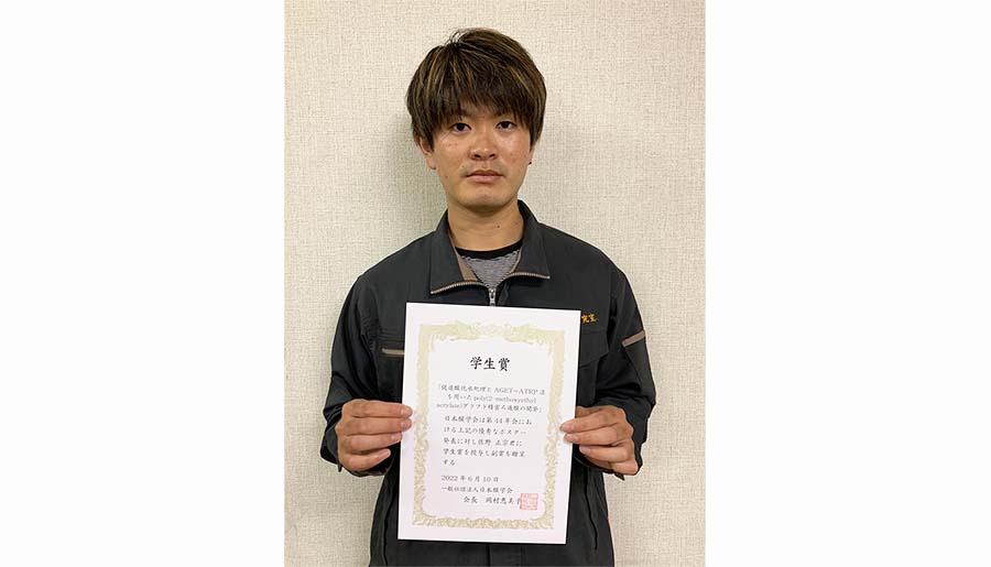 2022年6月9日~10日、オンライン・オンサイト併用開催となった日本膜学会第44年会において、化学応用学専攻修士2年の佐野正宗さん(エネルギーシステム工学研究室・赤松憲樹教授)が研究発表を行い、「学生賞」を受賞しました。