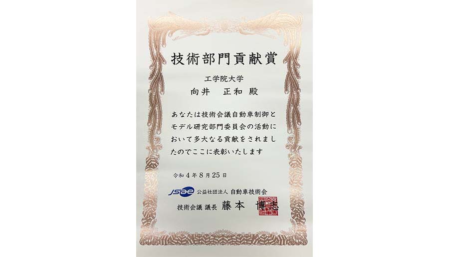 2022年8月25日向井正和准教授(電気電子工学科)が、自動車技術会の2021年度技術部門貢献賞を受賞しました。