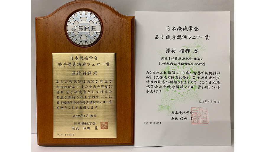 2022年3月15日にオンラインで開催された日本機械学会関東支部第28期講演会において、機械工学専攻2年の澤村将輝さん(マイクロシステム研究室・鈴木健司教授)が日本機械学会若手優秀講演フェロー賞を受賞しました。
