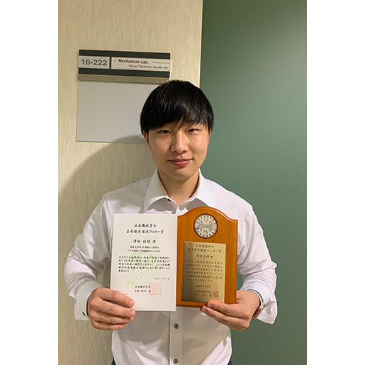 若手優秀講演フェロー賞は、日本機械学会の講演会において優れた講演を行った26歳未満の会員を対象として、20人に一人の割合で贈られるもので、発表内容の有益性や新規性、発表と質疑応答の態度などが評価されました。