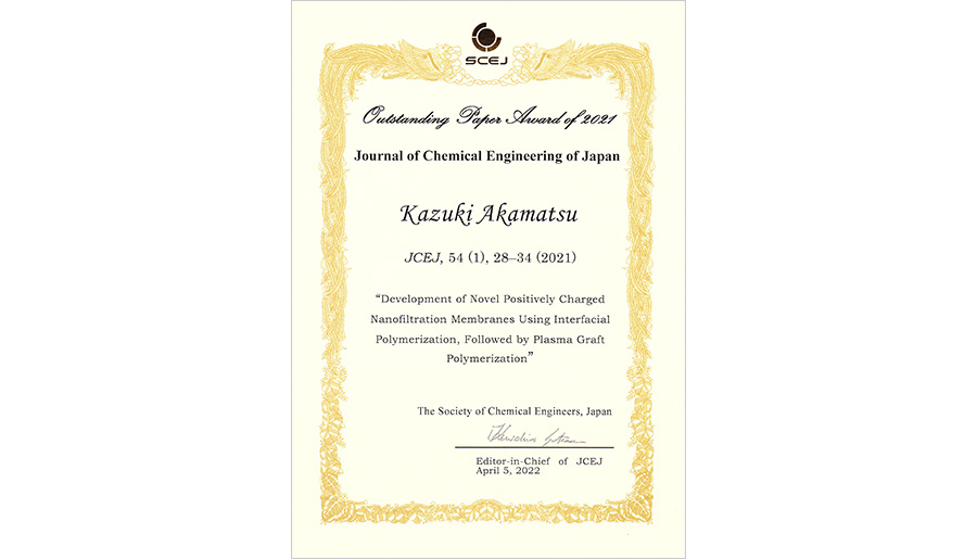 受賞対象の論文は、「Development of Novel Positively Charged Nanofiltration Membranes Using Interfacial Polymerization, Followed by Plasma Graft Polymerization」です。これは、製塩プロセス排水からの資源回収を実現するための新しいナノろ過膜の開発を報告する論文で、2021年1月に Journal of Chemical Engineering of Japan に掲載されました。