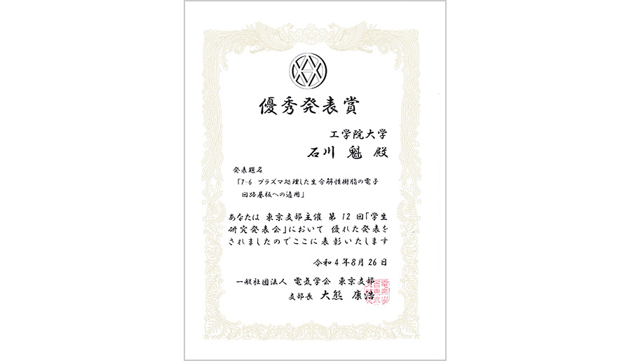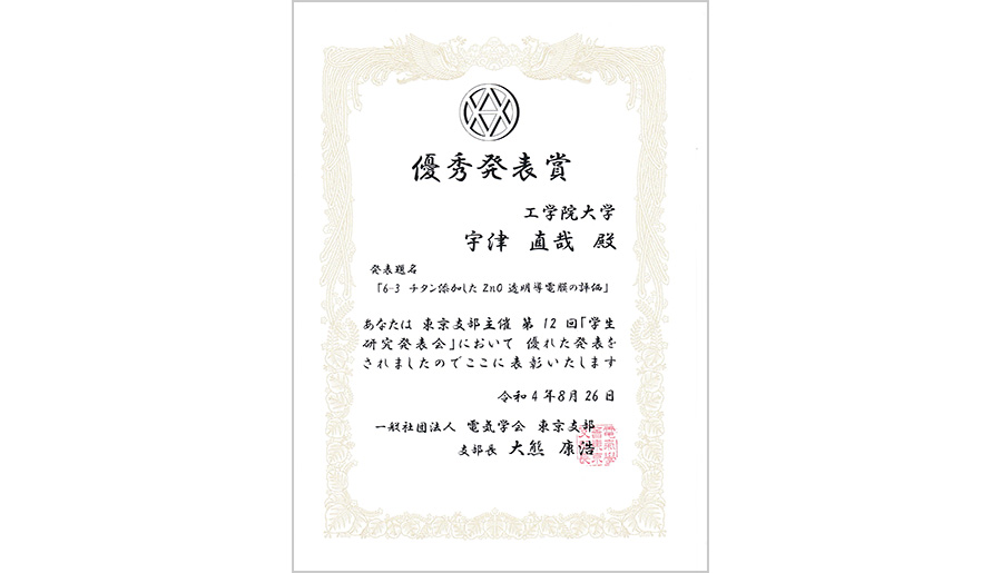 2022年8月26日に開催された電気学会東京支部第12回学生研究発表会において、工学部電気電子工学科の宇津 直哉さん(電気電子機能材料研究室・鷹野 一朗 教授)、石川 魁さん(電気電子機能材料研究室・鷹野 一朗 教授)が優秀発表賞を受賞しました。