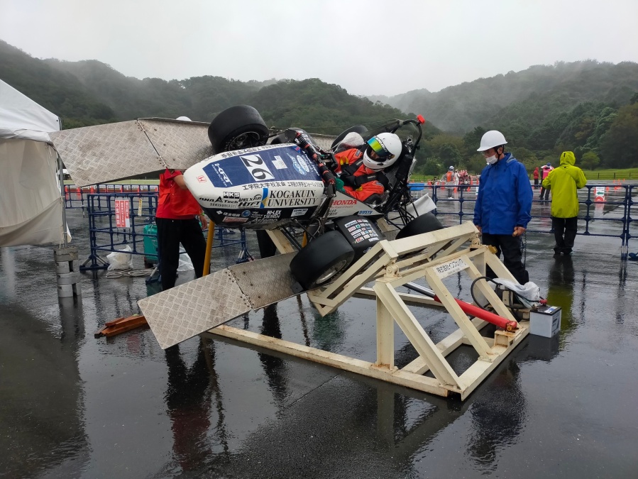 技術車検通過後は、スピーディにドライバー脱出試験、フラグテストを終え、その後もすぐにチルトテーブル試験、重量測定を終えることができました。車検終了の時間により、長蛇の列となっていた騒音試験を受けることができず、それに伴ってブレーキロック試験も受けることができませんでした。