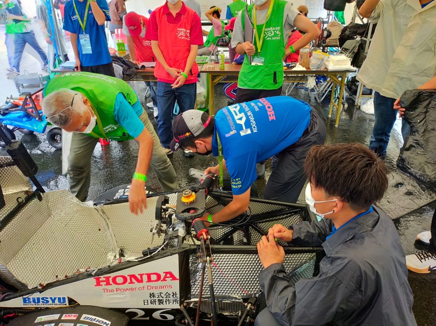 車検後、吸気系統の新規ステーの製作、リストリクター径のパテによる修正など各指摘事項への対応を精力的に行い、初回車検の5時間後には2回目の車検を受けることができました。2回目の車検では軽微な指摘を3つもらいましたが即座に修正を行い、3回目車検で技術車検合格となりました。