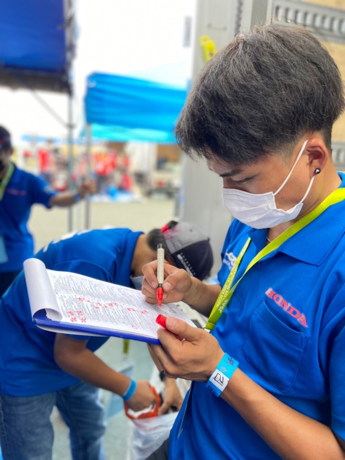 2日目は朝から雨が降り続き、時折かなり強い雨に打たれながらの1日となりました。朝一番には1日目で残した作業を早急に行い、定刻通りに技術車検に向かうことができました。