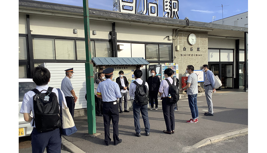 JR東北本線白石駅本屋が、DOCOMOMO Japanによる「日本におけるモダン・ムーブメントの建築」の選定建築物となりました。2022年9月26日(月)に同駅で選定記念レクチャー・見学会が実施され、 DOCOMOMO Japanの理事を務める大内田史郎教授(建築デザイン学科)が解説を担当しました。その後、JR東日本仙台支社にて選定プレートが贈呈されました。 大内田研究室(保存・再生デザイン分野)では、近代建築や産業遺産、駅舎などを研究テーマに扱っており、同研究室の学生が白石駅本屋の模型(1/100)を制作し、選定プレートの贈呈式には模型写真のパネルを持参しました。