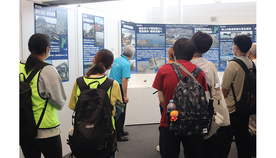 被災地でのボランティア活動は、東北福祉大学のコーディネートで実現しました。学生たちが訪れたあおい地区は、津波を受け復興計画により街並みが一転した歴史を持ちます。8月末にオンラインで交流していた3大学の学生たち9人は、地区の方々と清掃し、その後訪れた津波伝承館では、同館展示に協力する小野竹一あおい地区会長の語りにじっと聞き入りました。学生たちは、東日本大震災の揺れや命を守った行動が次の10年に繋がるには何をしたら良いかを考えながら、各地での防災啓発活動を今後も続けます。