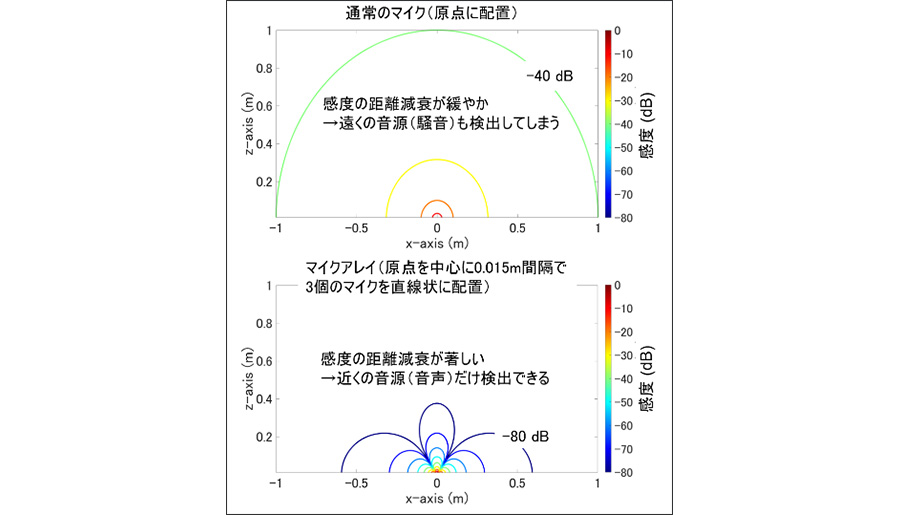 この特許技術をスマートフォン等の通話機器に応用すれば、周囲の騒音を拾わずに話者の音声のみを拾えると考えられます。一般的に、周囲の騒音源は遠くに位置するのに対し、話者の口元は近くに位置するためです。音声通話の明瞭度を改善する従来技術としては、騒音の成分を推定してから取り除く方法が知られていますが、推定誤差が生じると効果が損なわれます。特定の方向から届く音だけを拾いやすいマイクアレイも知られていますが、騒音源と話者が同じ方向に位置する場合には上手く機能しません。距離選択的な収音技術であるということが、本技術の特徴です。また、数個のマイクからなるコンパクトなアレイ構成で済むこと、アレイ信号処理が非常に単純であることから、実装しやすいと考えられます。