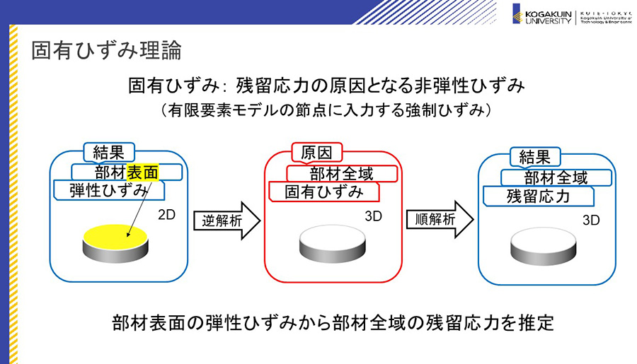 この技術は、自動車製造現場で多く利用されているエックス線回折装置を用いて、抵抗スポット溶接部全域の3次元残留応力について、車体を傷つけることなく推定できます。エックス線回折法では部材表面のみの計測に限られ、中性子回折法は専用施設での計測となり現場ではできません。小川准教授による手法では、製造現場でどんな深さでも内部の非破壊評価ができます。スポット溶接部の3次元残留応力を現場で非破壊に評価できれば疲労強度がわかるため、十分な安全性を確保しつつ、車体の軽量化を図ることが可能となります。部材表面のひずみを計測し、その値から部材全域の残留応力分布を推定します。
