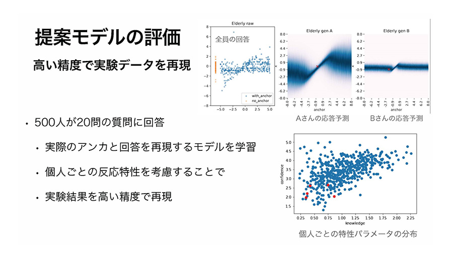 アンカリング効果は、マーケティングなどですでに活用されていますが、本研究では、個人特性を分類・抽出できることが特徴です(図の右上、Aさんの応答予測、Bさんの応答予測を参照)。そのため、マーケティング、SPI、オンライン教材などに付加価値が付けられると考えています。マーケティング、組織開発、教育分野などで使っていただけると効果的と考えております。